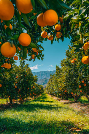 Orange grove with ripe fruits, lush green leaves, bright sky, rows of trees