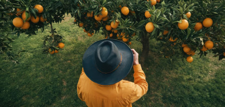Woman in a hat and yellow jacket stands in an orange orchard.