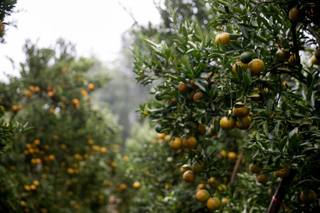 A breathtaking view of a lush orange orchard filled with ripe fruits, surrounded by misty landscapes, capturing the essence of natural beauty and tranquility.