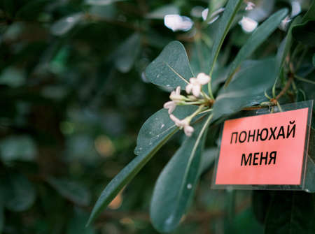 White flowers and note in Russian SMELL ME
