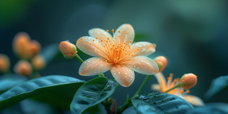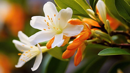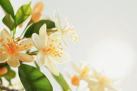 A fragrant white orange blossom with decorative leaves.