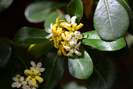 the flowering plant Pittosporum tobira, the Japanese pittosporum or Australian laurel, family Pittosporaceae. Small white-yellow flowers on a branch.