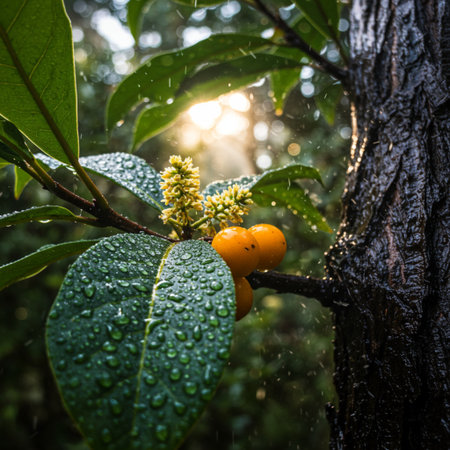 leaves of a tree glisten with raindrops, showcasing a captivating blend of light orange and dark emerald hues. this stunning photograph, captured by michael shainblum in the style of cranberrycore, features selective focus and the gentle touch of sunrays illuminating the scene. inspired by the beauty of mediterranean landscapes, this image evokes a sense of tranquility and natural splendor. ai generated