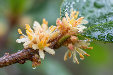 Close-up view of small, delicate flowers with water droplets clinging to their petals and the branch they are attached to. The flowers are a mix of white and pale yellow or orange tones. The branch is a light brown color, and the surrounding foliage is out of focus.