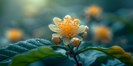 Coffee plant with blossom and fruits, with selective focus on blossom