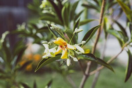 native Australian frangipani Hymenosporum plant with yellow and white flowers and ladybug shot at shallow depth of field