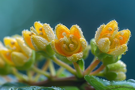 Dew-covered yellow flowers display vibrant petals and intricate details in morning light. the macro nature scene highlights the beauty and freshness of flora, emphasizing the minute droplets and delicate structures. Generative AI
