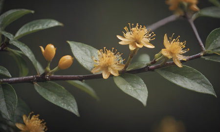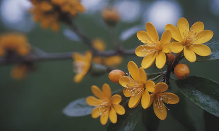 Close-up view of a cluster of small, yellow flowers with delicate petals and vibrant green leaves. The flowers are clustered together on a branch, and the focus is on the intricate details of the blossoms. The out-of-focus background provides a muted backdrop, drawing attention to the subject.