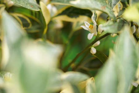 Branch of orange tree with white flowers and green leaves, retro toned