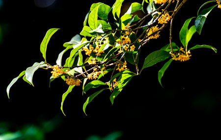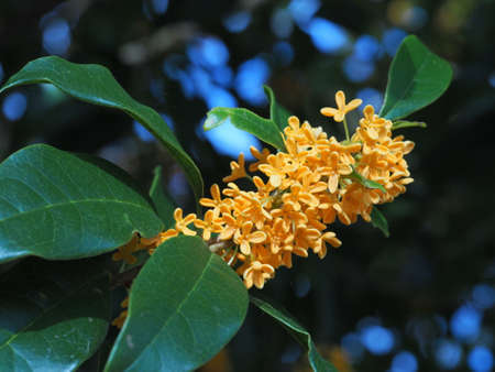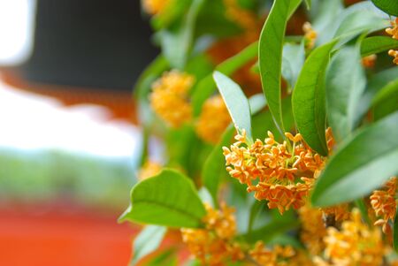 Fragrant orange colored olive flowers. Oleaceae evergreen tree. Fragrant orange flowers bloom from September to October. Corollas are used for wine and tea, and for medicinal.