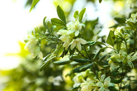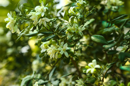 Fragrant orange jessamine (Kamini) white flowers on the green tree. Close-up of wet white Madhu Kamini flowers in summer season