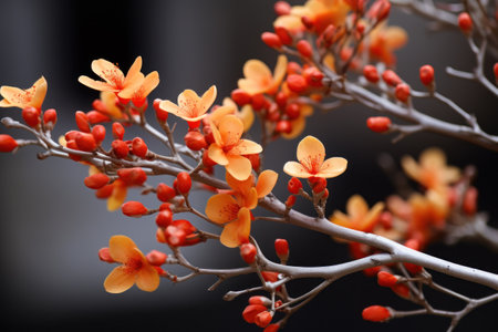 a branch with orange flowers and berries