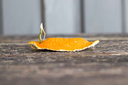 Orange peel on a green and white background. Selective focus.