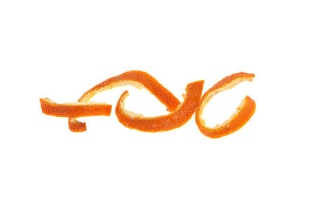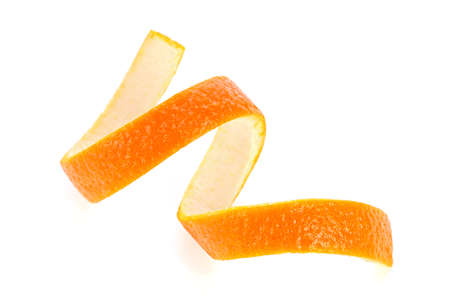 Orange peel in a twisted spiral, isolated against a bright white background