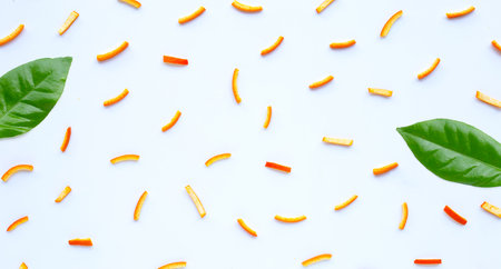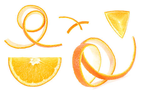 Orange peel curls artistically spread out on a bright white backdrop