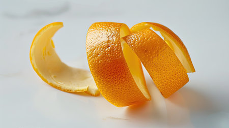An exquisite spiral of orange peel gracefully curls atop a clean white marble backdrop, showcasing the vibrant color and intricate texture. This artful display evokes freshness and creativity.