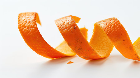 An artistic representation of vibrant orange citrus zest featuring a curled shape against a clean white background, perfect for culinary themes and fresh designs.