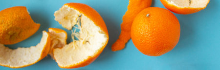 Many fresh orange fruits and peels on light blue background. Vibrant horizontal banner of citrus with copy space top view. Tropical plants with vitamin C