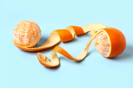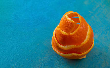 Artistic image with fruit. Background with spiral mandarin peel on a blue wooden table. Close-up and texture with orange peel.