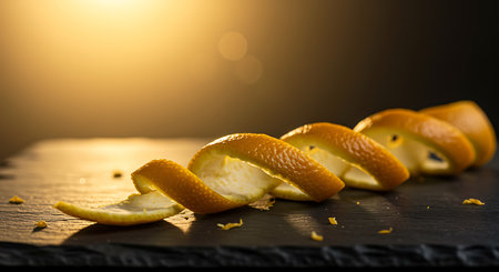 Captivating spiral orange peel bathed in warm golden light on dark slate, perfect for adding zest and freshness to culinary or lifestyle content.