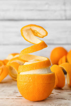 Fresh orange with peel on white wooden background
