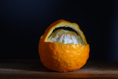 Bright orange peel showcases a hidden fruit inside, highlighting the beauty of natural sweetness and vibrant colors.