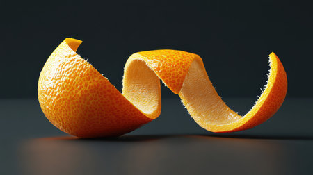 A captivating close-up of a spiraled orange peel showcasing its vibrant color and unique shape, reflecting the beauty of nature and freshness.