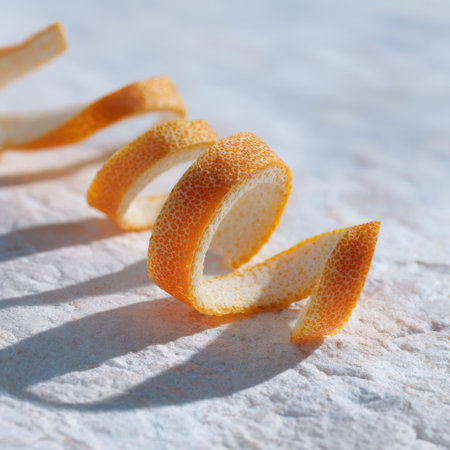 Fresh orange peel forms graceful swirls, capturing the essence of citrus freshness and hinting at the potential for zesty summer detox drinks, herbal infusions, or flavorful additions to recipes