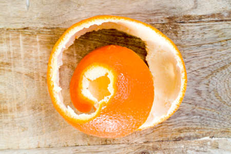 peeled ripe orange mandarin, mandarin peel lies in the form of a spiral, close-up citrus