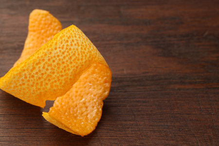 Fresh orange peel on wooden table, closeup. Space for text