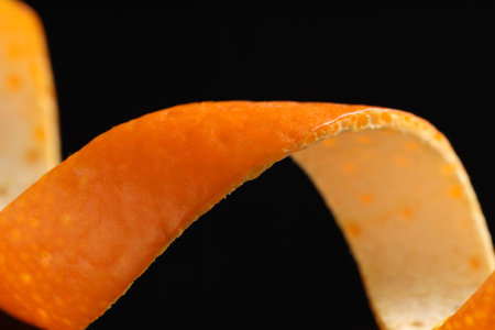 One curly orange peel on black background, macro view