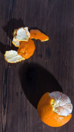 Half-peeled tangerines on an old natural wooden table close-up, space for text