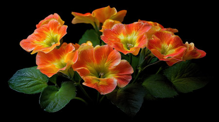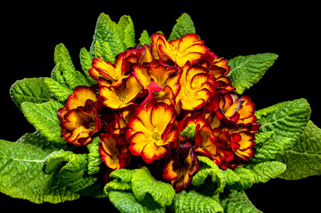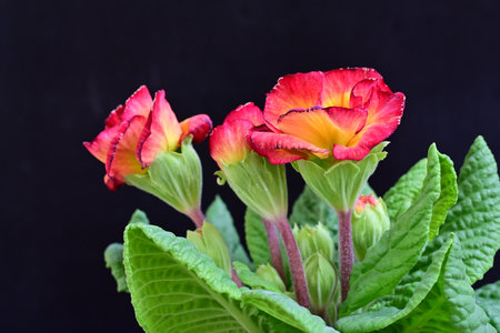 Colorful primula flowers isolated on black background. Primula vulgaris
