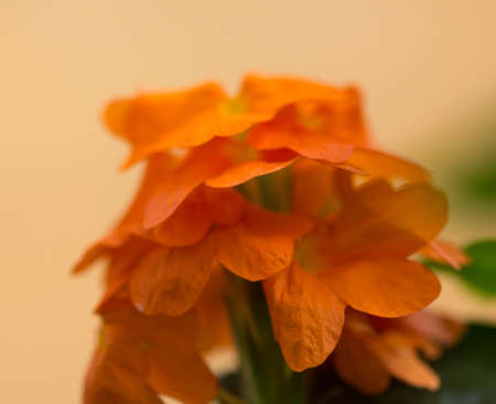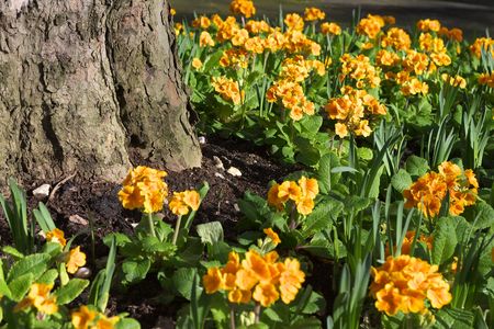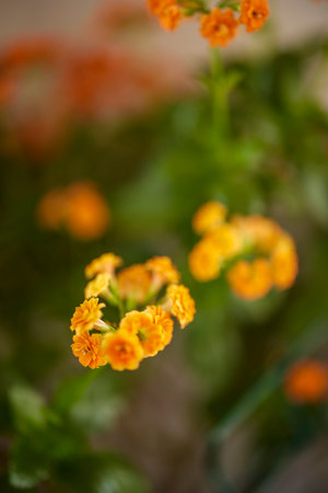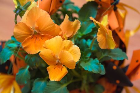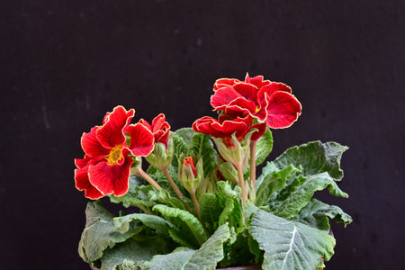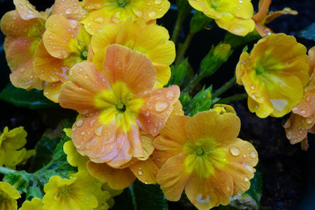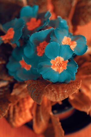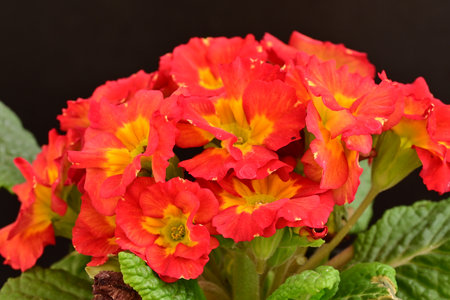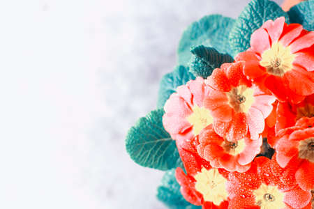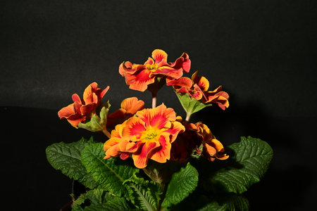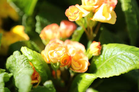 Orange primrose (Primula vulgaris hybrid) potted spring flower. Macro. Copy space. Selective focus