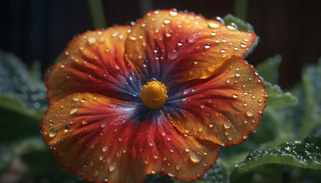 A close-up photo of a vibrant red and yellow Primula flower with dew drops on its petals, isolated against a dark background