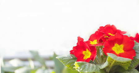 spring flowers. Blooming red primrose or primrose flowers on a white background with space for text on the left. Congratulations.