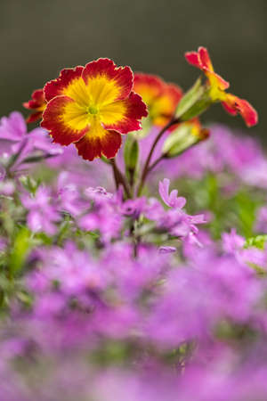 Purple yellow Primrose Primula blossom. Country Garden Primula Flower.