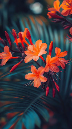 close-up of orange vireya rhododendron plant with coral flowers outdoor shot at shallow depth of field in the golden light