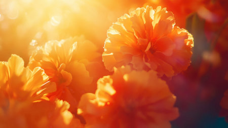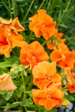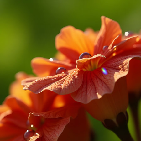 A cluster of delicate orange flowers bloom against a vibrant green background in a summer garden.