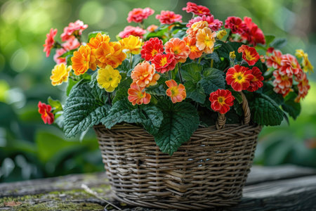 A bright primrose in a wicker basket standing on burlap next to ceramic pots. spring blossom
