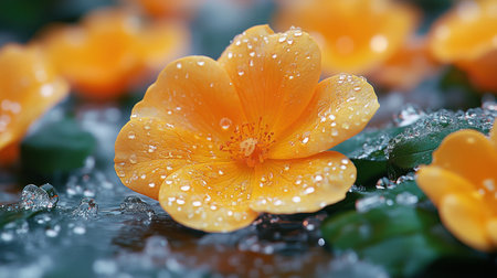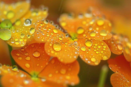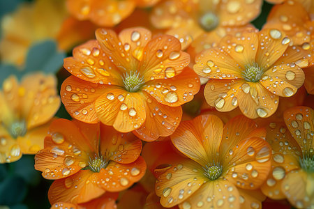 Soft rain falling gently on Polyanthus, with water droplets forming and slowly dripping. The background is softly blurred with a natural, moody atmosphere.