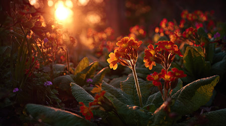 The Polyanthus at sunset, Golden red sunset light filters through the leaves, still atmosphere, warm orange glow blending with natural green tones.