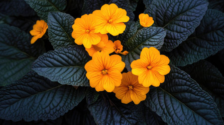 Close-up of yellow primula flowers with orange centers and green leaves, set against a blue background
