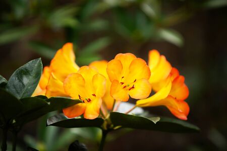 Picturesque orange Rhododendron flowers in springtime, bright petal of orange flowers against blurred shadow backgrounds.