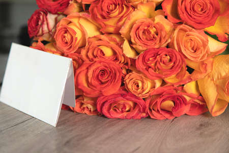card with bouquet of roses on table