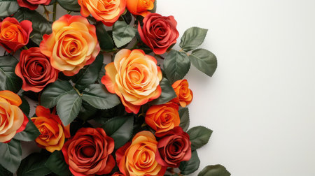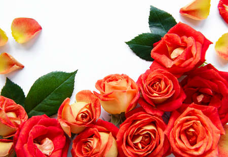 Top view of orange and red roses on white background with copy space