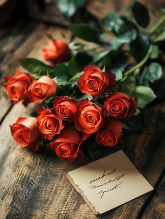 Fresh roses tied together with greenery and a handwritten note sit on a rustic wooden table, creating a warm and inviting atmosphere.