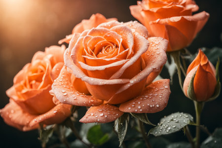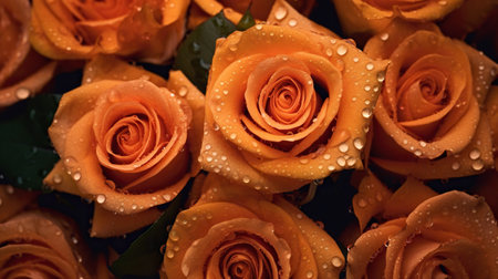 Orange Roses flowers with water drops background. Closeup of blossom with glistening droplets. Generative AI.
