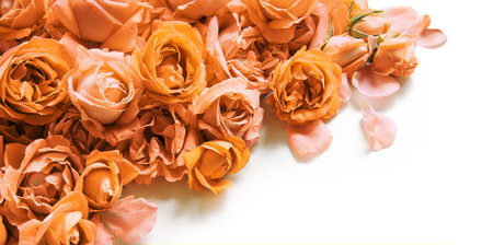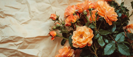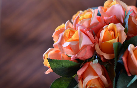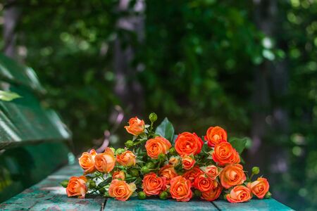 Bouquet of orange roses and empty space for your text. Selective focus. Banner