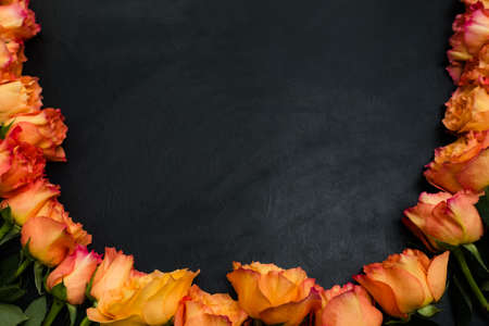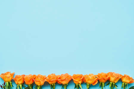 Orange roses border on a light blue background. Valentines Day, Mothers Day concept. Copy space, top view